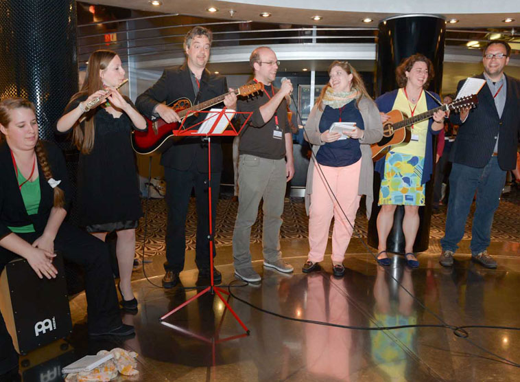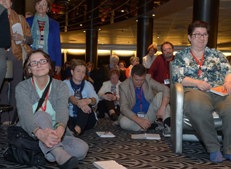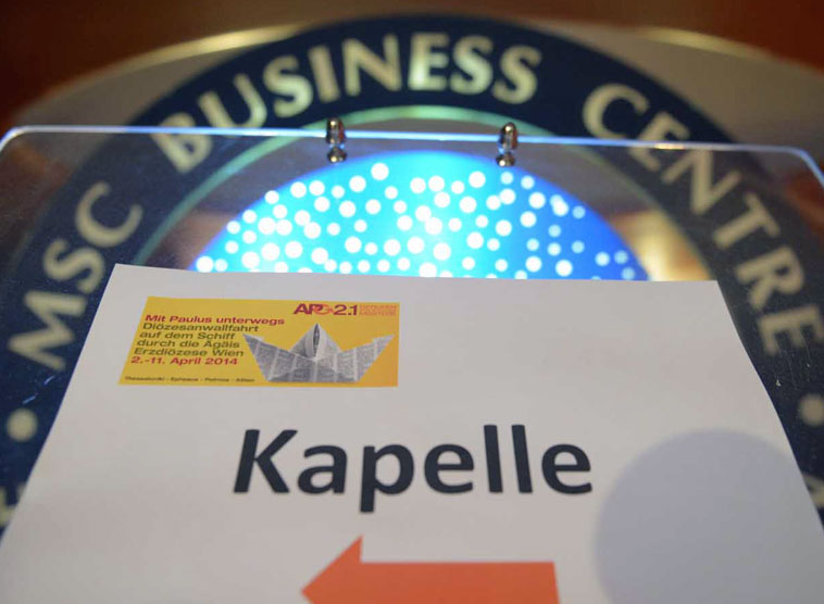 Wallfahrtsorganisatorin und Leiterin der Stabsstelle APG, Andrea Geiger, hat schon viele derartige Abende gestaltet, allerdings noch nie in einer Disco. Geistliche Impulse in einer Disco? Passt denn das zusammen? Ja, das tut es: Die Disco am Oberdeck des Kreuzfahrtschiffes, das die rund 500 Pilger, 1.500 weiteren Gäste und 900 Angestellte durch die Ägäis steuert, wurde zu einem Ort des gemeinsamen Singens, Beichtens, der Impulse, des Beichtens, des Gebetes und der Stille.