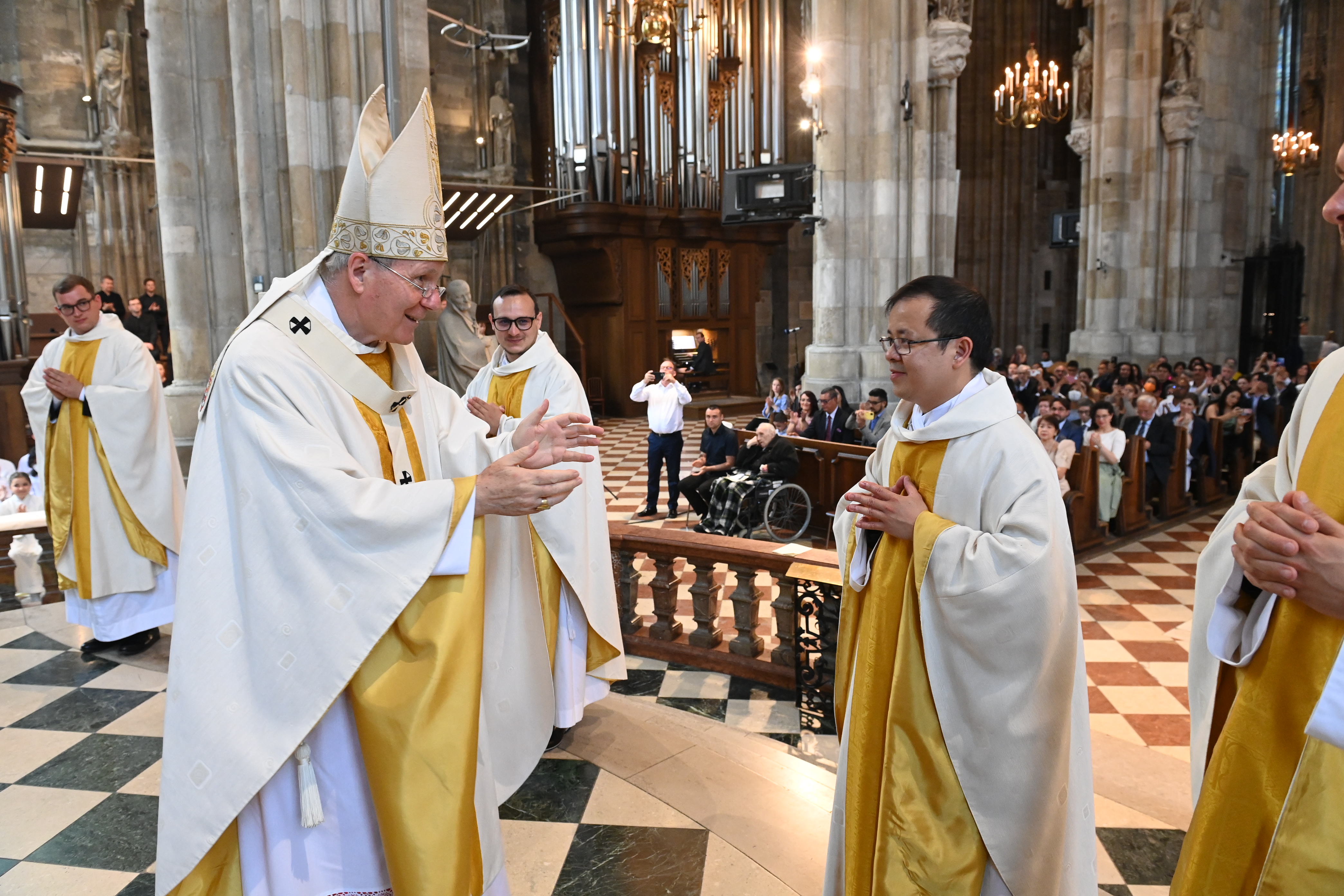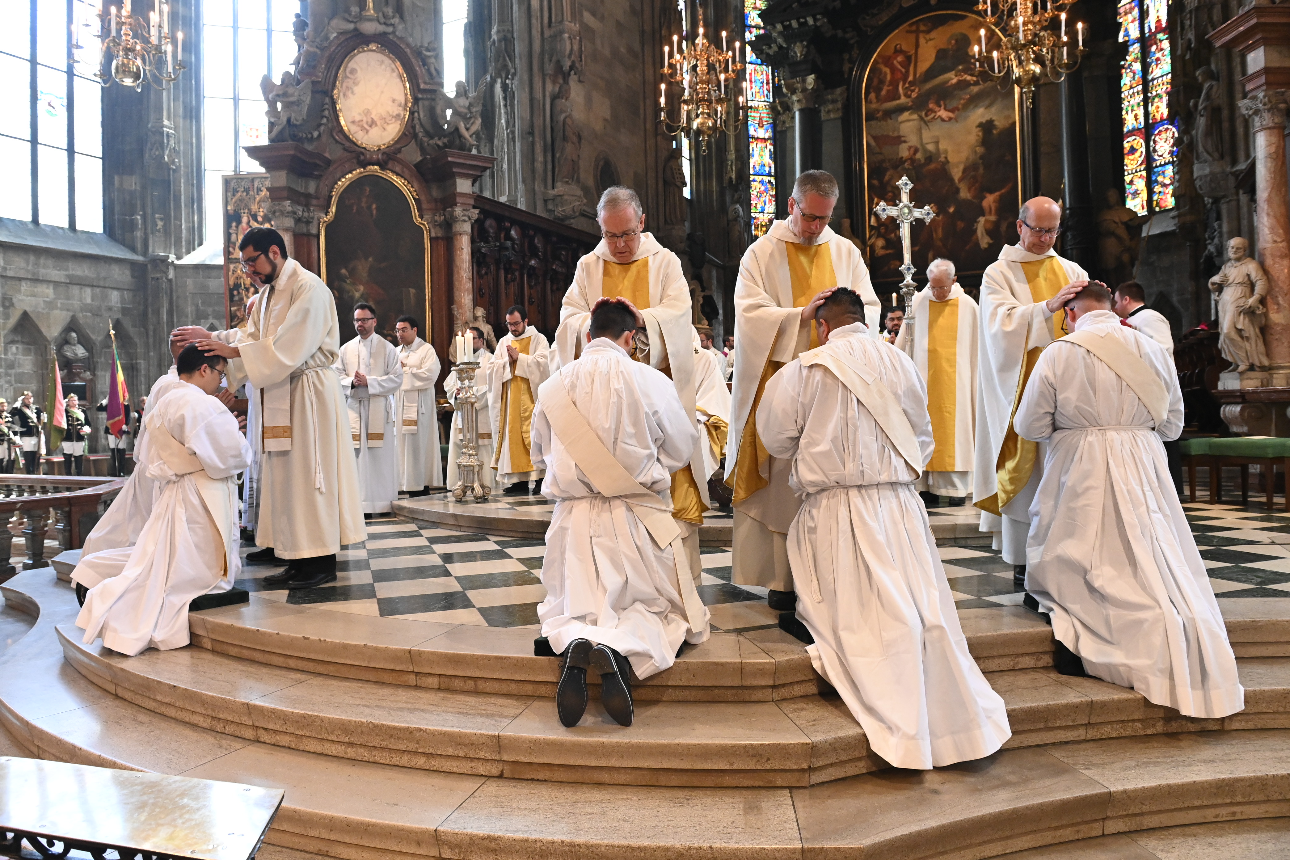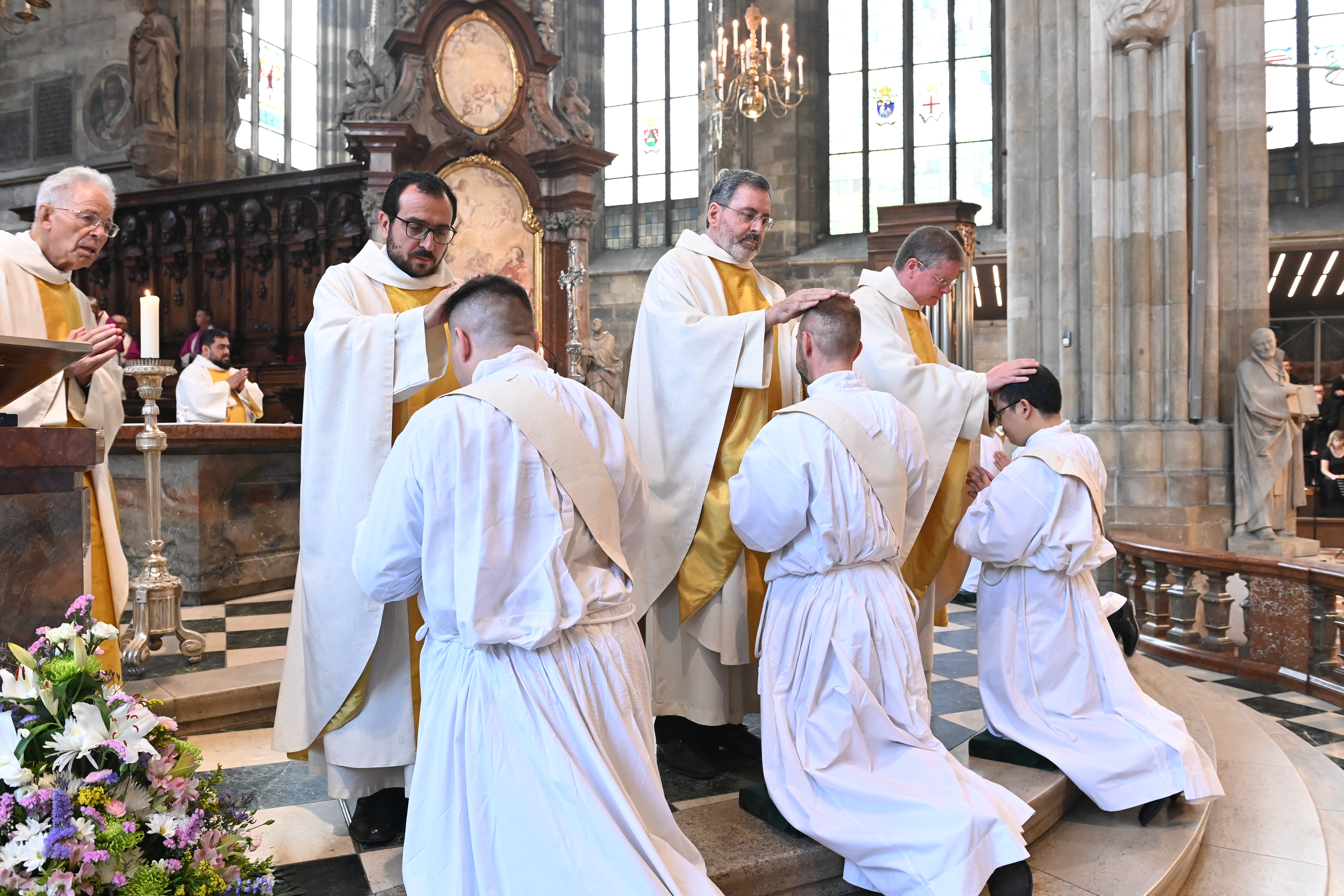 Kardinal Schönborn mit den Neupriestern Mark Eylitz, Thorsten Rabel, Pawel Skrzypinski aus dem Wiener Priesterseminar sowie Billy Yap Camba , Alonso Ramirez Garcia und Leandro Josue Venegas Chinchilla aus dem Diözesanen Missionskolleg Redemptoris Mater.