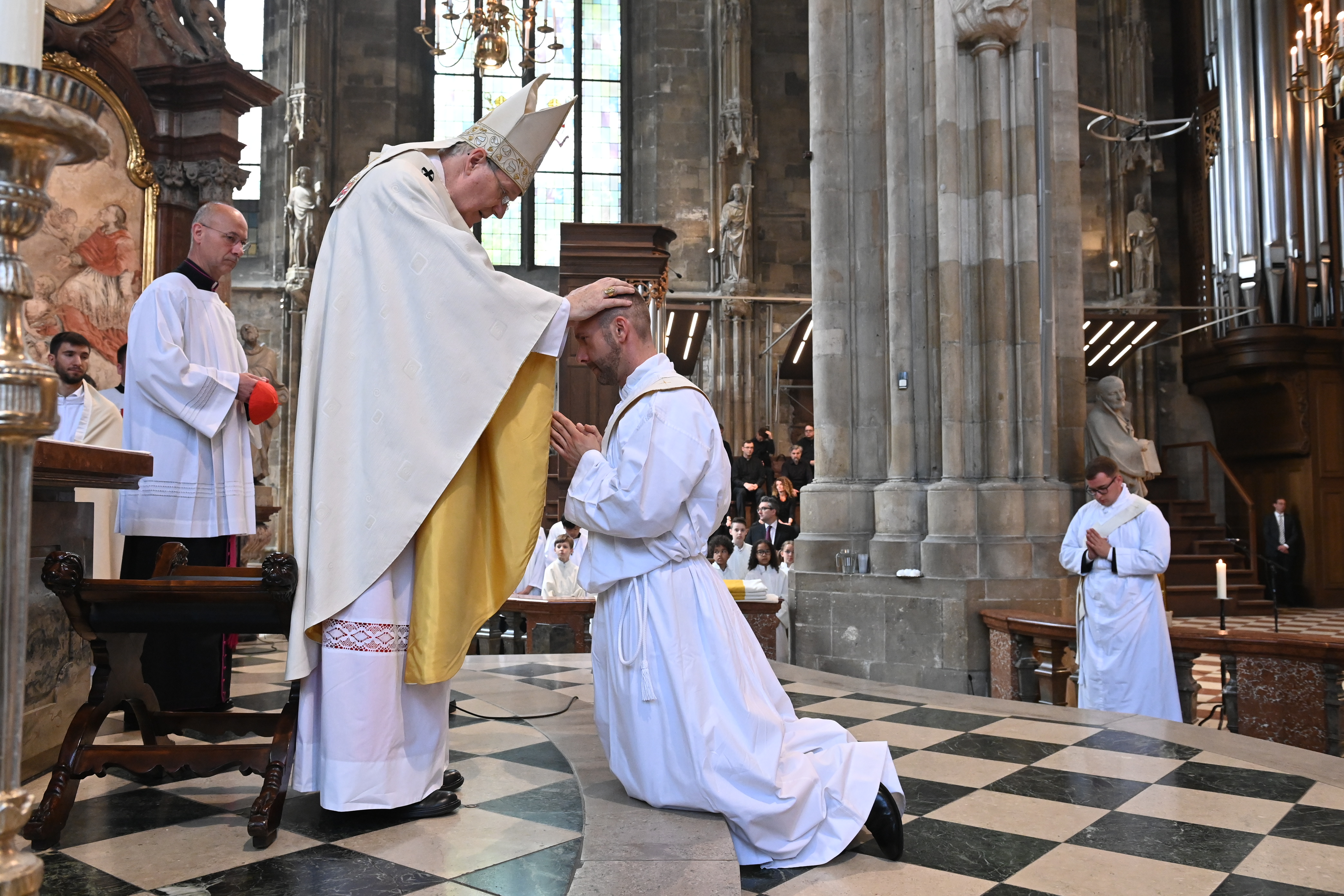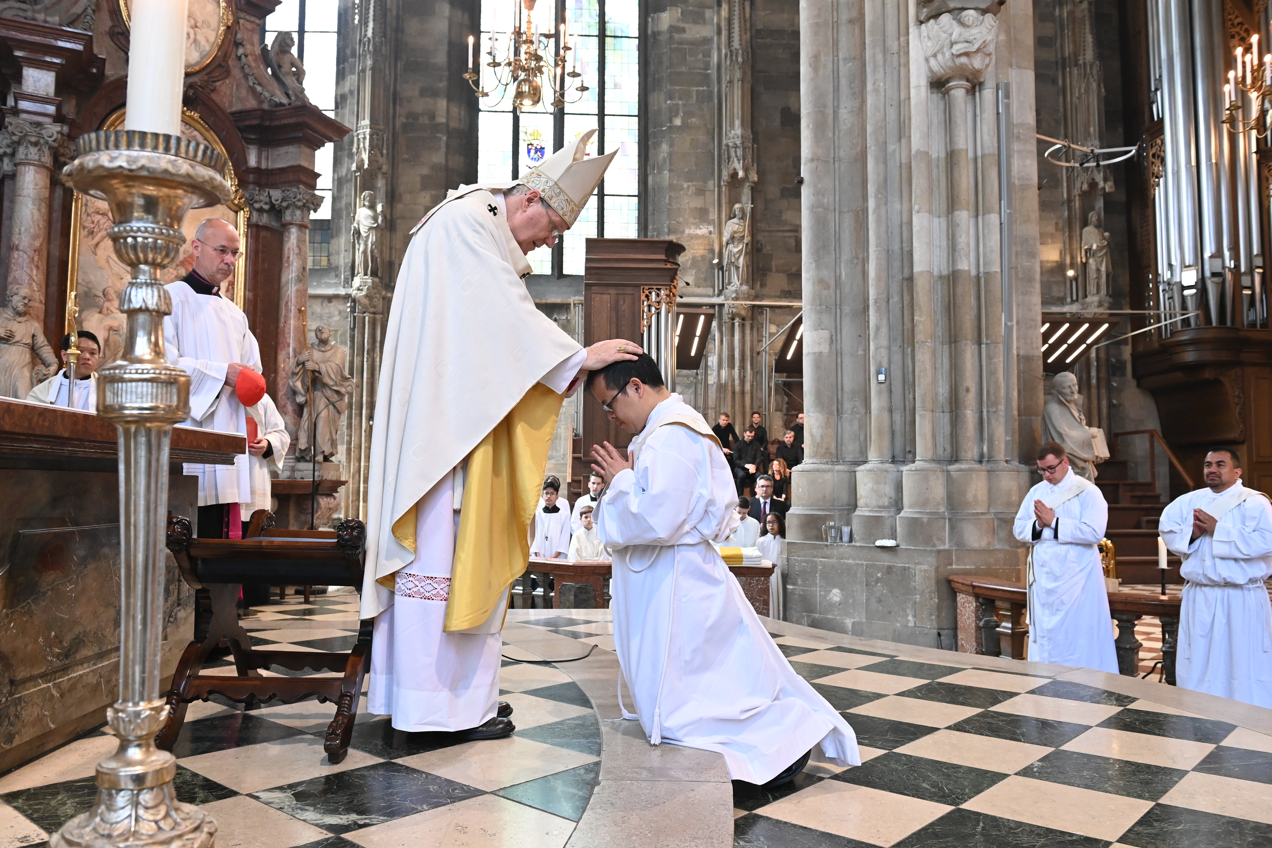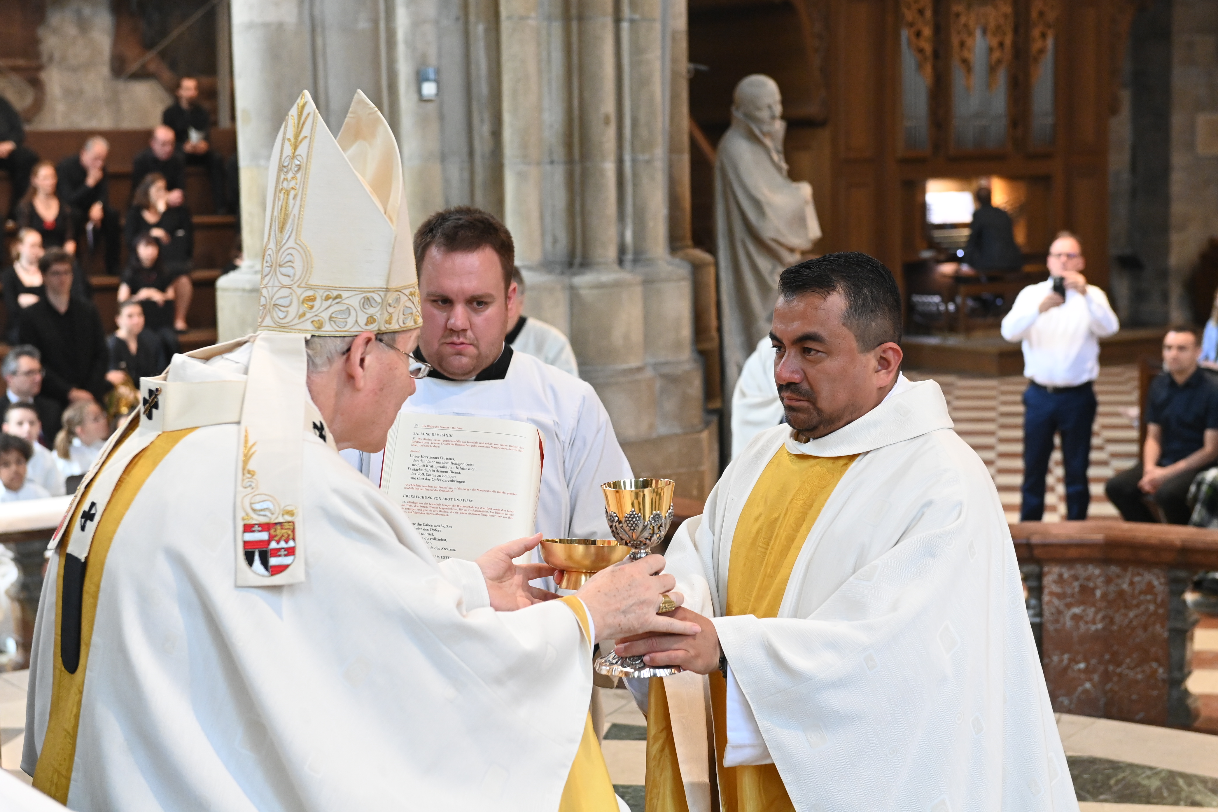 Kardinal Schönborn mit den Neupriestern Mark Eylitz, Thorsten Rabel, Pawel Skrzypinski aus dem Wiener Priesterseminar sowie Billy Yap Camba , Alonso Ramirez Garcia und Leandro Josue Venegas Chinchilla aus dem Diözesanen Missionskolleg Redemptoris Mater.