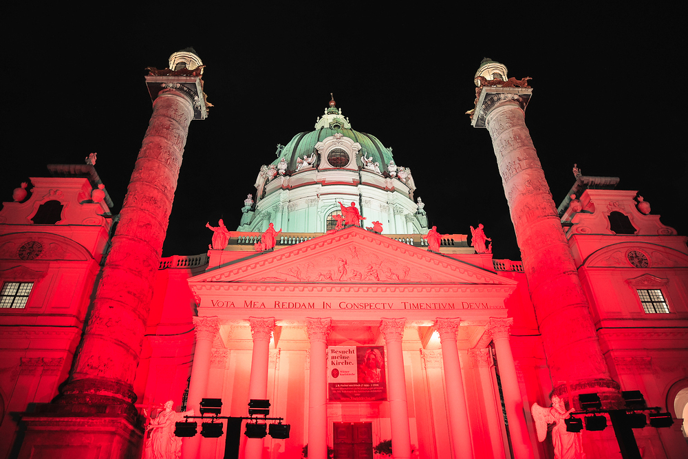 In ganz Österreich werden heuer wieder mehr als 130 Kirchen, Stifte, Klöster und Monumente rot angestrahlt, darunter auch das Parlament in Wien, die Karlskirche und der Stephansdom.