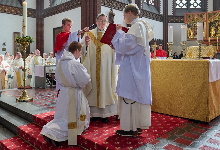 Am Samstag, den 6. April 2024 spendete Bischof Dr. Matthias Heinrich das Weihesakrament an zwei junge Dominikaner in der Berliner Klosterkirche St. Paulus. Rafael Maria Klose OP wurde zum Diakon und Justinus Grebowicz OP zum Priester geweiht.