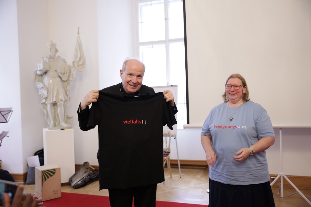 Die Berufsgemeinschaft überreichte Schönborn als Dank ein T-Shirt mit der Aufschrift „vielfaltsfit“. Dieses Wort spiegle die Grundhaltung Schönborns gut wider, so die Vorsitzende der Berufsgemeinschaft, Michaela Spies (rechts).
