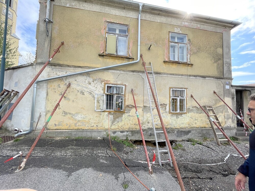 In Niederrussbach ist der gesamte Kirchenhügel aufgeweicht, und mehrere Keller sind eingestürzt. Auch die Friedhofsmauer hat schwere Schäden erlitten. Der alte, vermietete Pfarrhof ist stark einsturzgefährdet und muss dringend gesichert werden.