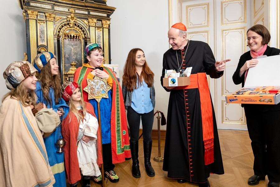 Kardinal Schönborn empfing vier Sternsinger-Kinder aus der Pfarre Inzersdorf-St. Nikolaus stellvertretend für die insgesamt 85.000 Kinder und Jugendlichen, die als Caspar, Melchior und Balthasar ab heute bis 6. Jänner von Haus zu Haus ziehen und die weihnachtliche Friedensbotschaft und Segenswünsche für das neue Jahr überbringen. Gleichzeitig bitten sie um Spenden, um Menschen in den ärmsten Regionen der Welt zu unterstützen.