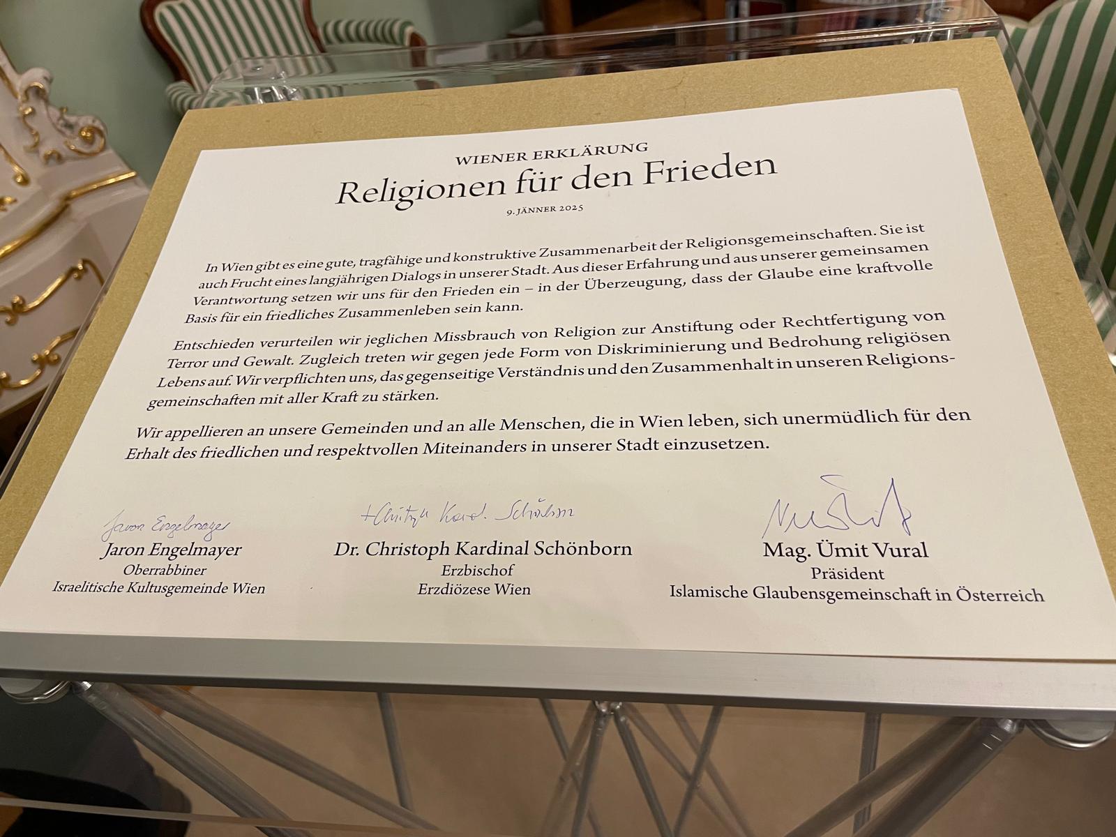 Am Donnerstagnachmittag, dem 9. Januar 2025, fand im Erzbischöflichen Palais in Wien ein historisches Treffen der Repräsentanten von Islam, Judentum und der römisch-katholischen Kirche statt. Kardinal Christoph Schönborn, Oberrabbiner Jaron Engelmayer und der Präsident der Islamischen Glaubensgemeinschaft in Österreich (IGGÖ), Ümit Vural, unterzeichneten gemeinsam die „Wiener Erklärung“. Mit diesem Dokument bekräftigen sie ihr Engagement für Frieden und gegenseitigen Respekt in der Gesellschaft.