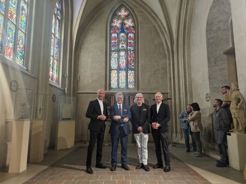 V.l.n.r.: Dompfarrer Toni Faber, Dombaumeister Wolfgang Zehetner, Künstler Peter Baldinger und Domkustos Michael Landau freuten sich sehr, das komplettierte Michaelsfenster präsentieren zu können.