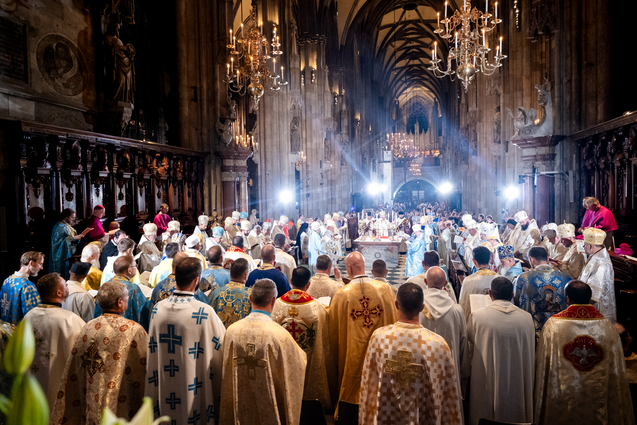 Eine "Göttliche Liturgie" im Wiener Stephansdom mit mehr als 50 Bischöfen war Mittwochabend der liturgische Höhepunkt der Vollversammlung der Bischöfe der katholischen Ostkirchen Europas. Dem Gottesdienst stand Großerzbischof Swjatoslaw Schewtschuk, Oberhaupt der Ukrainisch-katholischen Kirche, vor. Mit ihm konzelebrierten zahlreiche Metropoliten und Bischöfe. Kardinal Christoph Schönborn, Ordinarius für die katholischen Ostkirchen in Österreich, und Kardinal Claudio Gugerotti, Präfekt des Dikasteriums für die orientalischen Kirchen, nahmen ebenfalls teil; dazu von römisch-katholischer Seite u.a. auch der Wiener Weihbischof Franz Scharl, der Apostolische Administrator Josef Grünwidl, Domkustos Rudolf Prokschi oder der Generalsekretär der Bischofskonferenz, Peter Schipka.