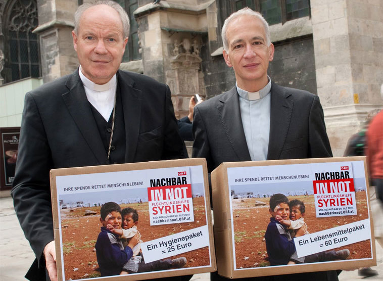 "Jeder, der in Not ist, ist ein Nachbar. Diese Menschen sind wirklich in Not, und sie sind deshalb wirklich unsere Nachbarn", so Kardinal Schönborn zur Aktion "Nachbar in Not", die angesichts der dramatischen Situation in Syrien einen eigenen Schwerpunkt gesetzt hat. Helfen könne man mit einem Lebensmittelpaket um 60 Euro, wodurch eine "Familie einen Monat lang beim Überleben unterstützt" wird, indem sie mit Nahrung versorgt wird. Helfen könne man auch mit Hygienepaketen um jeweils 25 Euro, "weil es auch wichtig ist, dafür zu sorgen, dass jetzt keine Seuchen ausbrechen und den Menschen diese Form einer ganz basalen Versorgung zukommt", erläuterte Caritasdirektor Landau.