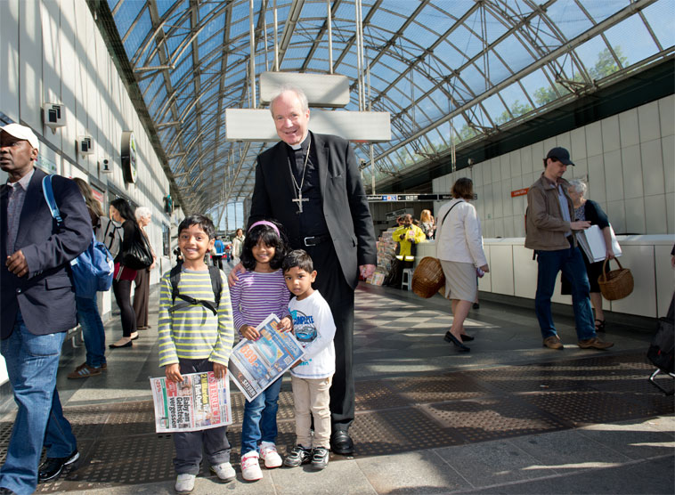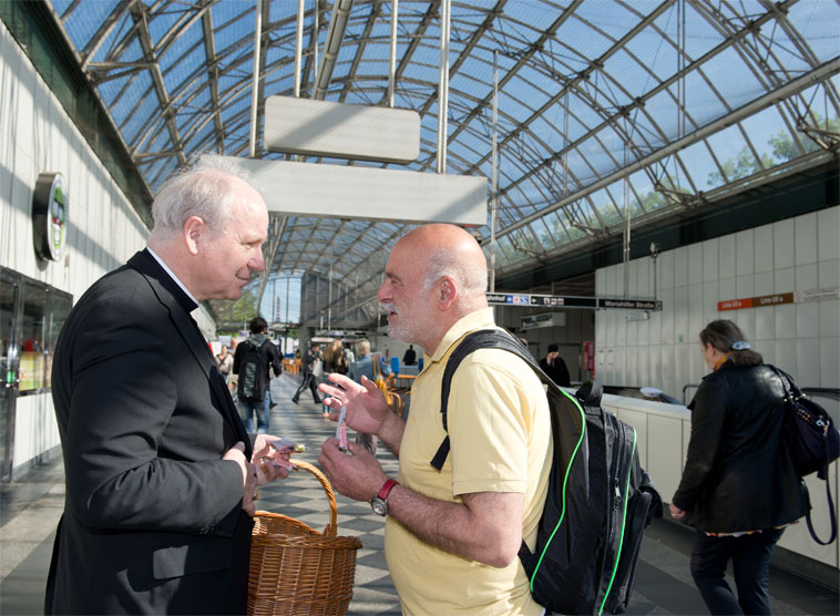 Kardinal Christoph Schönborn besucht derzeit das Wiener Stadtdekanat 6/7. Am Program stand am Mittwoch, 12. Juni 2013, auch eine missionarische Initiative: Eine Begegnung mit Pendlern und anderen Passanten am Westbahnhof. Dabei verteilte Kardinal Schönborn Grußaufkleber und Schnitten.