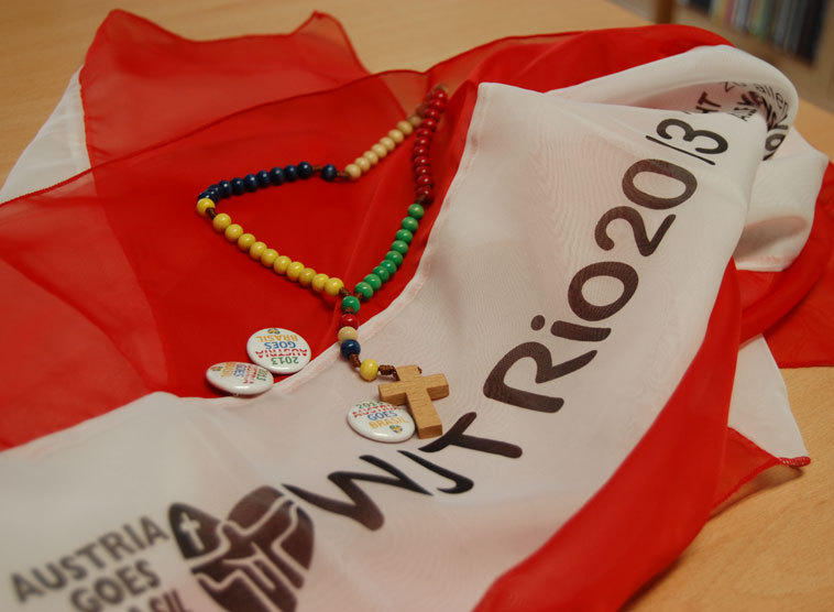 Ein bunter Rosenkranz, Buttons und ein rotweißrotes Tuch erhalten die 560 Jugendlichen beim Österreichertreffen am Dienstag, 23. Juli. Am Programm steht eine "Doppelconference" zwischen Kardinal Christoph Schönborn und Weihbischof Franz Lackner.