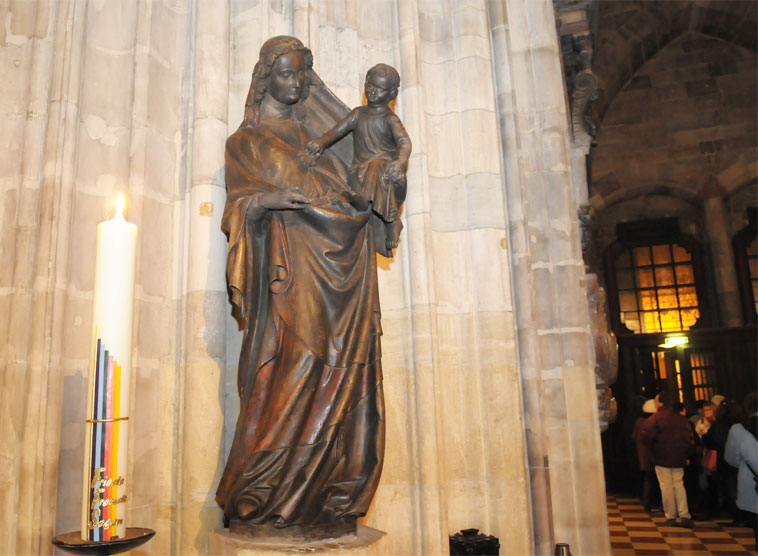 Schluss der Führung zeigt Domexperte Klaus Brenner seinen Zuhörern noch ein besonderes Stück. Die so genannte Dienstbotenmadonna neben der Taufkapelle. Den Namen hat sie durch eine Legende erhalten. "Sie soll einer reichen Frau gehört haben, die ihren Schmuck vermisst hat und ihr Dienstmädchen beschuldigt hat, ihn gestohlen zu haben. Sie ging in die Kapelle zum Beten und der Schmuck wurde wiedergefunden. Eine wunderbare Statue, vor der auch heute noch viele beten."