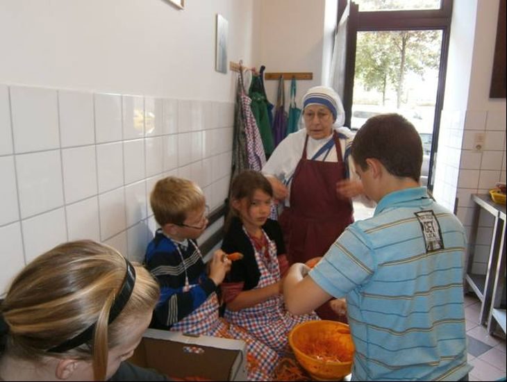 Bei den "Mutter-Teresa-Schwestern" wurde gemeinsam "Klostersuppe" gekocht, die dann an Bedürftige und Obdachlose verteilt wurde. Das Programm orientierte sich nach dem, was im Kloster normalerweise passiert. So wurde zum Beispiel bei den Missionarinnen der Nächstenliebe gemeinsam Speisen für Bedürftige gekocht und ausgegeben.