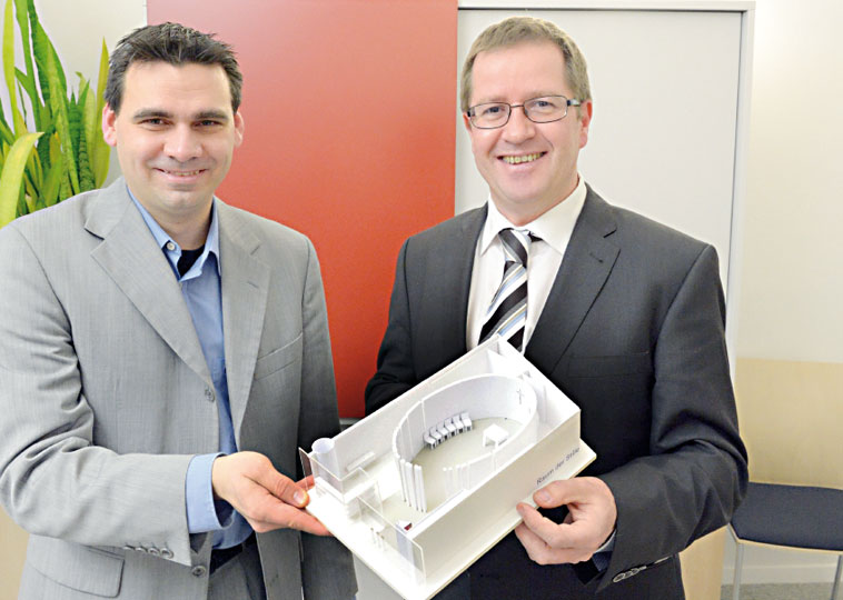(Projektkoordinator Roman Dietler und Martin Wiesauer, Geschäftsführer der "Kategorialen Seelsorge", halten das Modell der neuen Bahnhof-Kirche in ihren Händen)