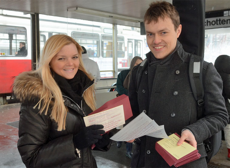 In Wien werden die "Liebesbriefe von Gott" am Morgen des 14. Februar an vielen Verkehrsknotenpunkten verteilt.