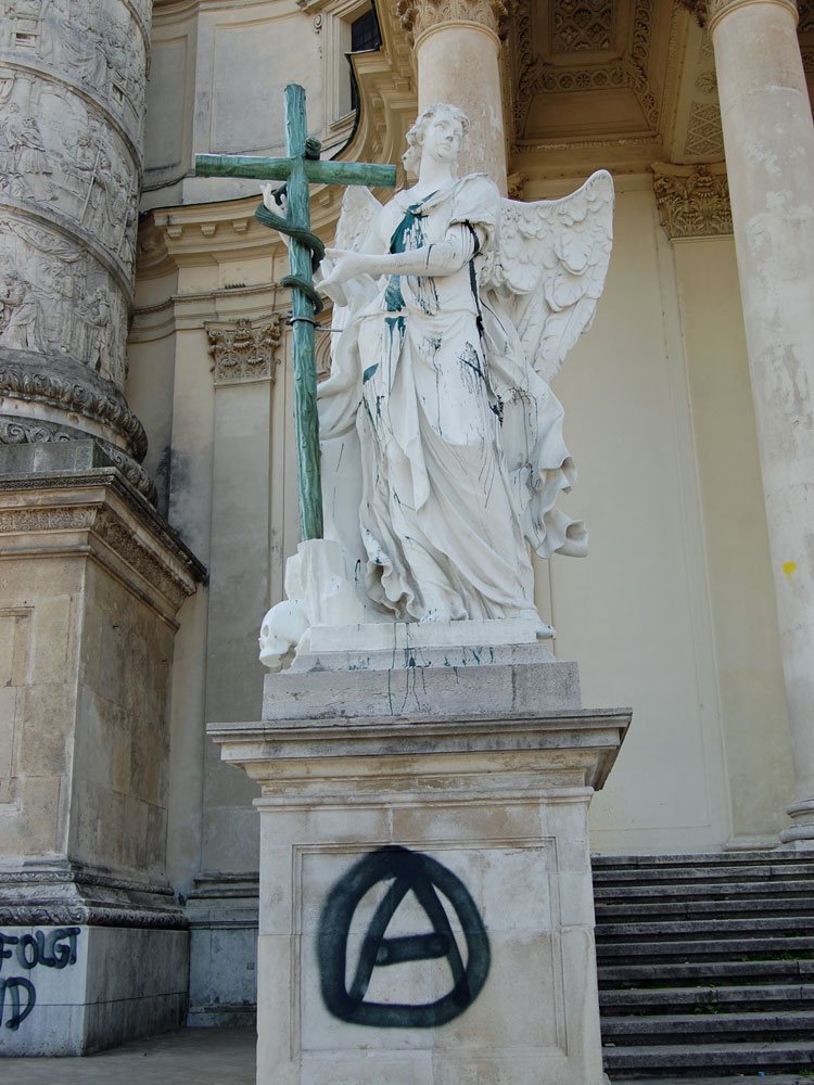 Unbekannte haben am Samstag, 3. Mai die Karlskirche in Wien mit Farbbeuteln beworfen und mit Parolen beschmiert.
