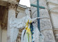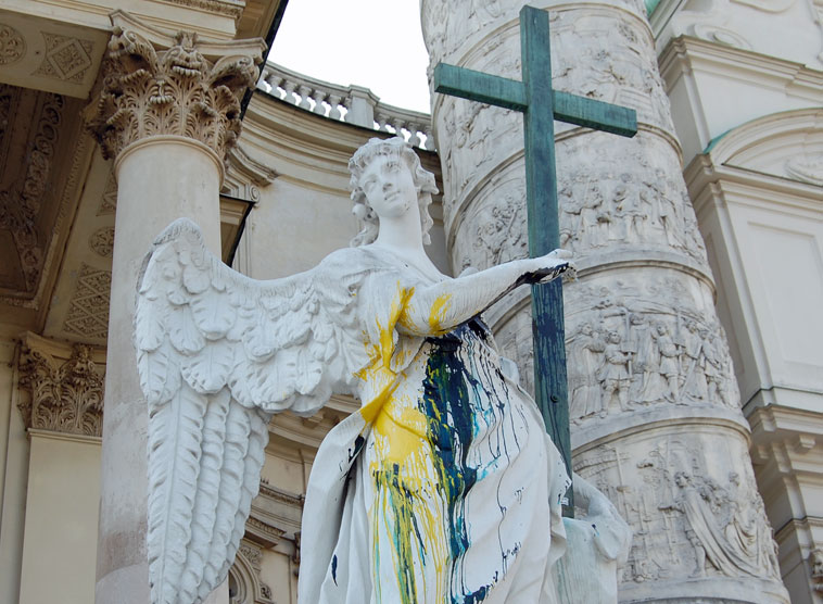 Teile der Fassade der Wiener Karlskirche müssen nach einer Beschmierung durch bislang unbekannte Täter erneut restauriert werden. In der Nacht von Samstag, 24. auf Sonntag, 25. Mai 2014, hatten Vandalen mit grauer Farbe gefüllte Luftballons auf die rechten Gebäudeseite der Kirche geworfen. Auch die rechte Engelsstatue wurde dabei beschädigt, berichtete Johannes Pasquali vom Verein "Freunde und Gönner der Wiener Karlskirche" am Montag. Zwei Reinigungsfirmen seien derzeit bereits am Werk, um die Schäden zu beziffern und zu beheben.