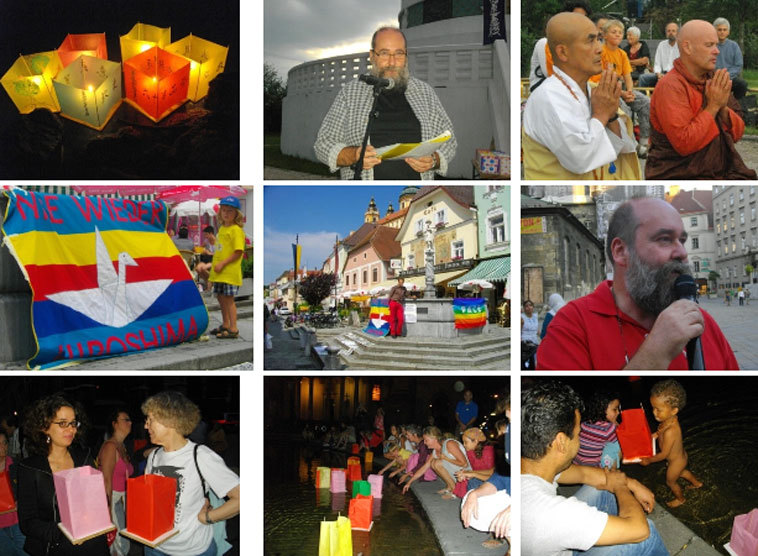 Am Samstag, 9. August 2014, wird um 20.00 Uhr mit einer traditionellen Buddhistischen Lichterzeremonie bei der Wiener Friedenspagode der Opfer von Hiroshima und Nagasaki gedacht (Wien 2, Hafenzufahrtsstraße, Bus 80B).