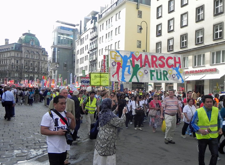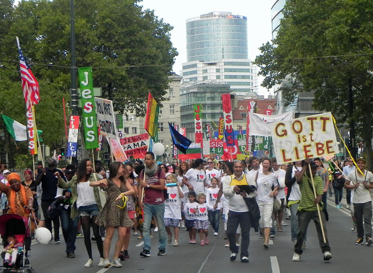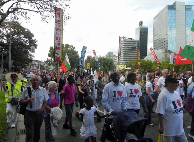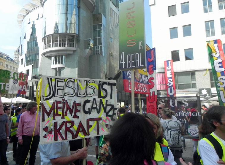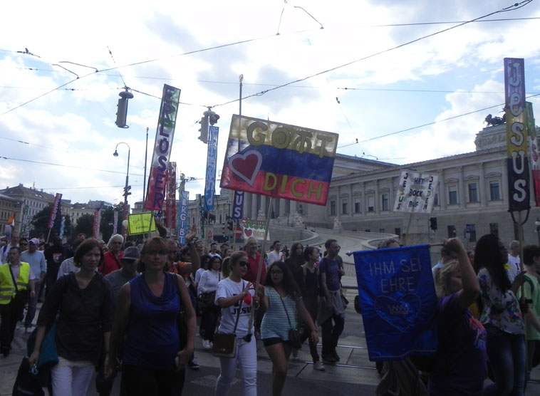 Insgesamt 12.000 Christen unterschiedlichster Konfessionen haben laut Polizeizählung am Samstag, 20. September 2014, in Wien an einem "Marsch für Jesus" teilgenommen. Vom Stephansplatz aus zogen die Gläubigen via Rotenturmstraße einmal die gesamte Ringstraße entlang, bevor sie sich am frühen Abend erneut vor dem Stephansdom zu einem "Fest für Jesus" mit Musik und Glaubenszeugnissen versammelten. Die Teilnehmer trugen Schilder und T-Shirts mit Botschaften wie "I love Jesus" oder "Jesus liebt Wien". Trommeln und Gesänge prägten den farbenfrohen Marsch über den Ring.