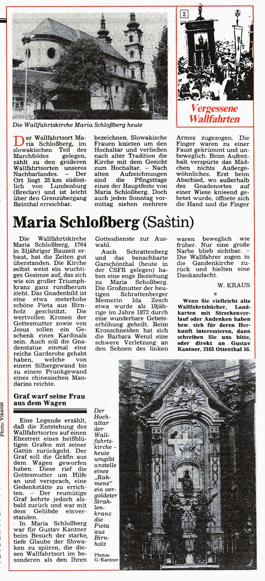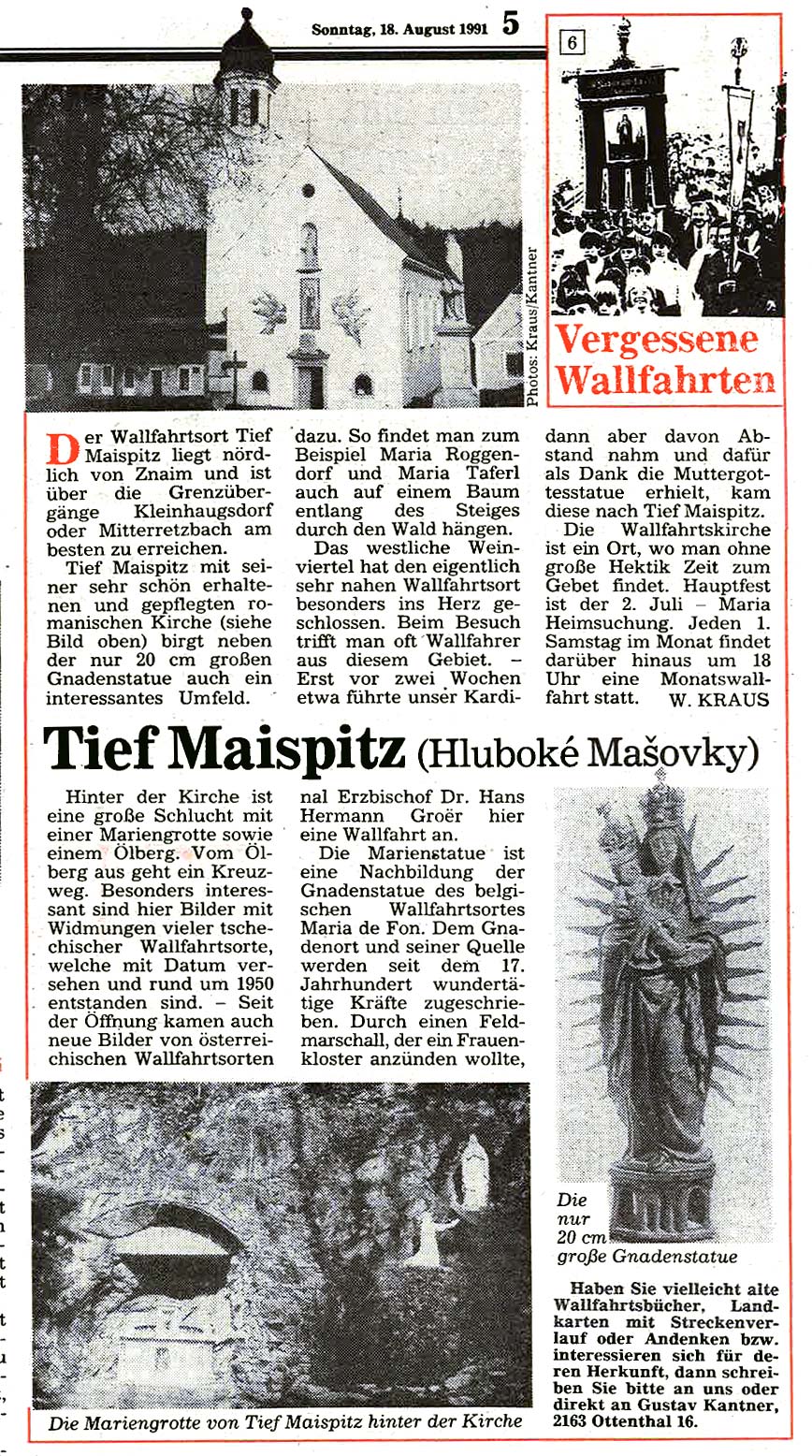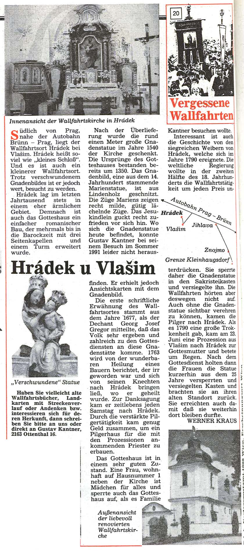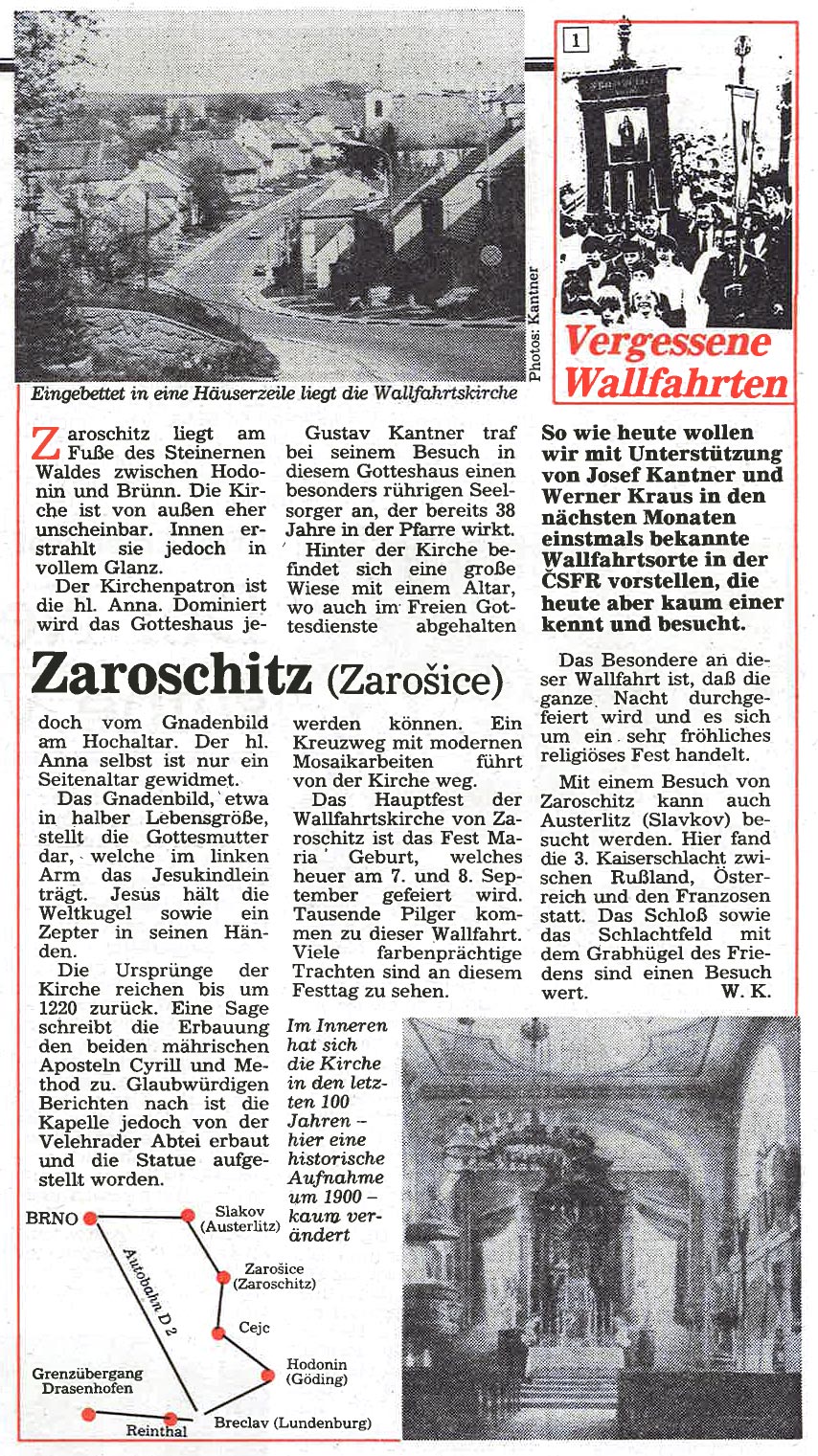 Immer schon interessierte sich der Landwirt Gustav Kantner aus Ottenthal im Weinviertel für die fast vergessenen Wallfahrtsorte jenseits der streng bewachten Grenze und wurde später zum leidenschaftlichen "Wallfahrtsreisenden". Ab Mai 1991 begann er für die damalige "Wiener KirchenZeitung" mit Unterstützung von Werner Kraus diese "Vergessenen Wallfahrtsorte"wieder vorzustellen – mit oft überraschenden Ergebnissen.