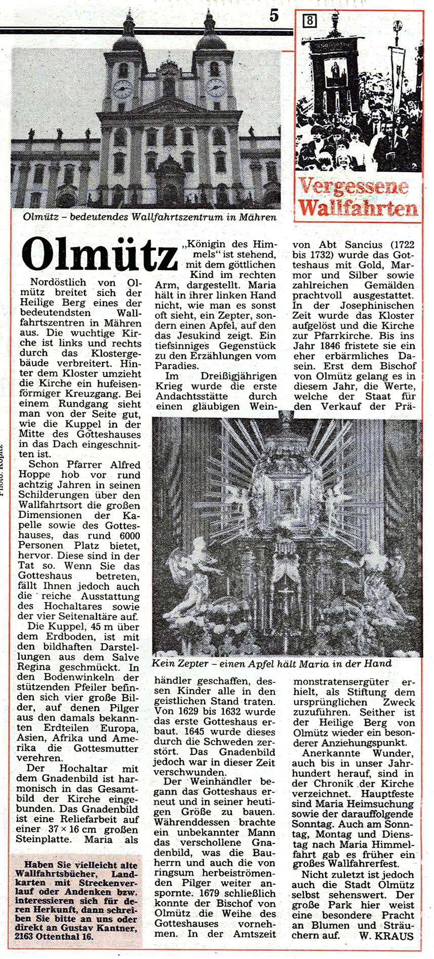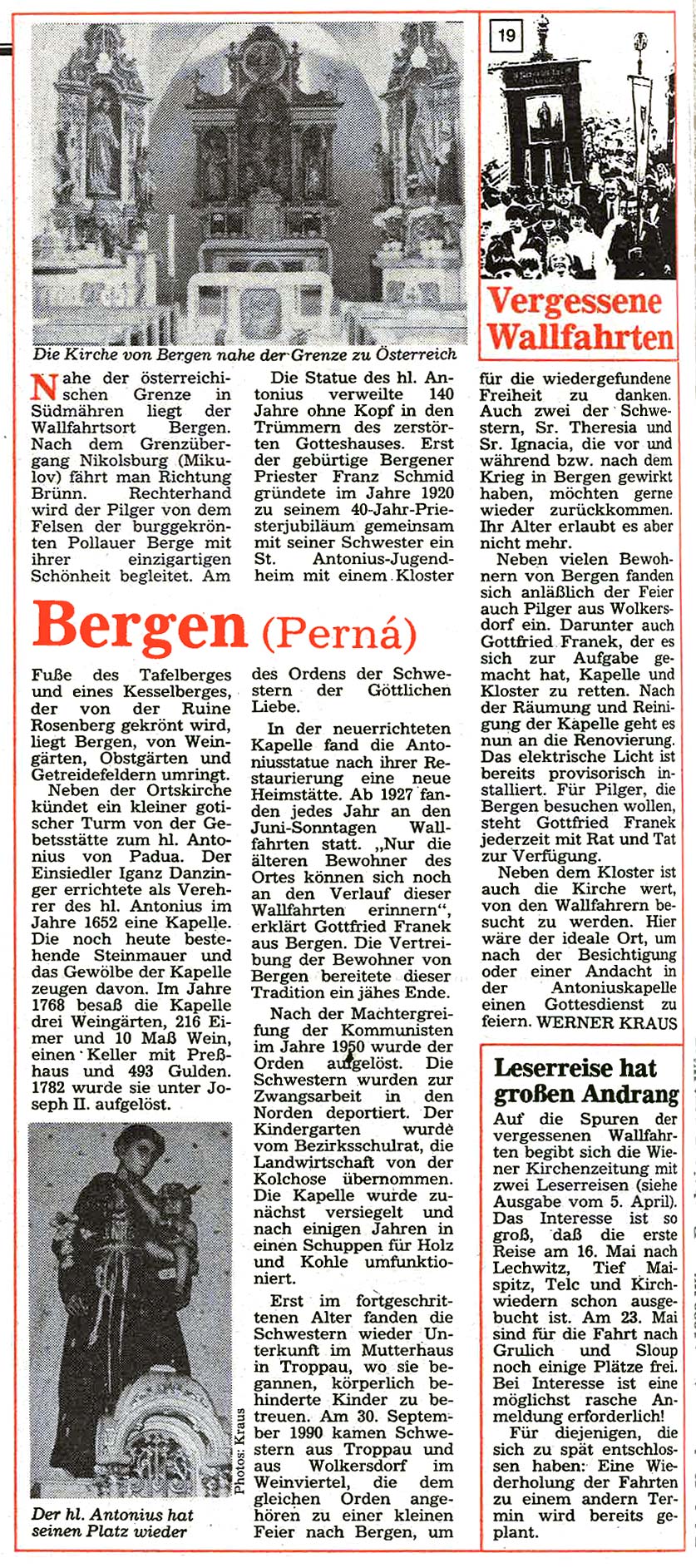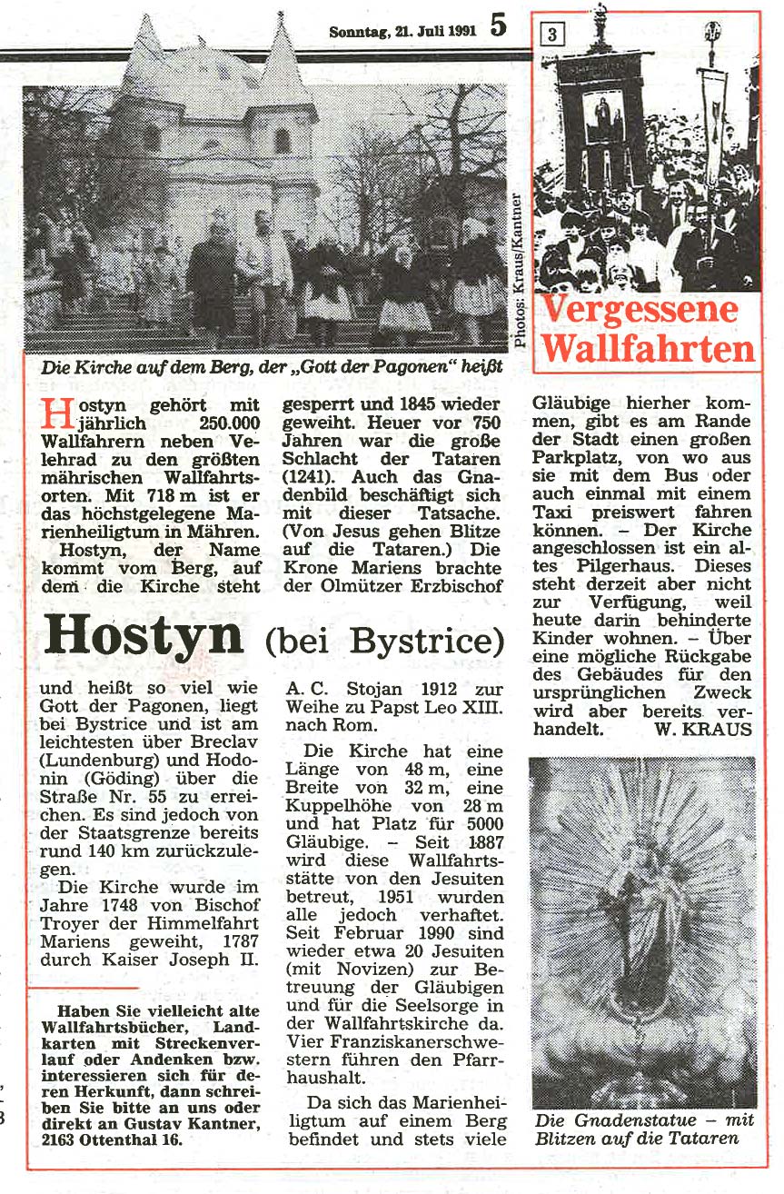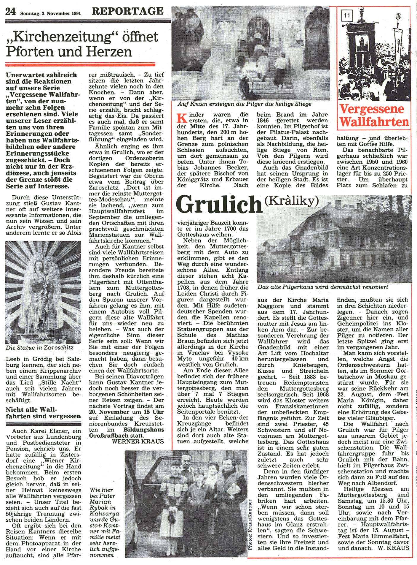 Immer schon interessierte sich der Landwirt Gustav Kantner aus Ottenthal im Weinviertel für die fast vergessenen Wallfahrtsorte jenseits der streng bewachten Grenze und wurde später zum leidenschaftlichen "Wallfahrtsreisenden". Ab Mai 1991 begann er für die damalige "Wiener KirchenZeitung" mit Unterstützung von Werner Kraus diese "Vergessenen Wallfahrtsorte"wieder vorzustellen – mit oft überraschenden Ergebnissen.