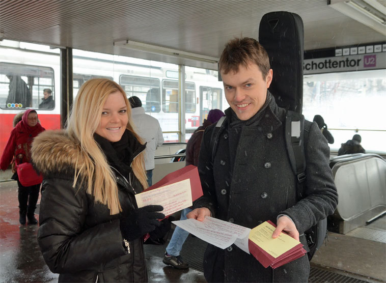 Bis 12. Jänner 2015 können sich Interessierte für eine der erfolgreichsten Missionsinitiativen der letzten Jahre, die Valentinsaktion "Liebesbriefe von Gott" anmelden. Dann werden wieder hunderte Valentinsbotinnen und –boten die Briefe verteilen. In Bahnhöfen, U-Bahnstationen oder auf Einkaufsstraßen zaubern sie den Menschen auf dem Weg in die Arbeit, in die Schule oder zum Einkaufen, ein Lächeln ins Gesicht.