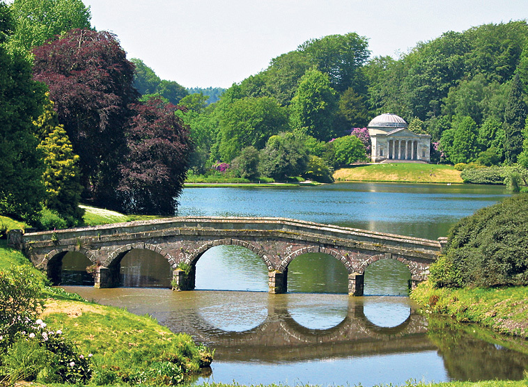 Das begehbare Landschaftsgemälde von Stourhead: der See mit der palladianischen Brücke und dem Pantheon.