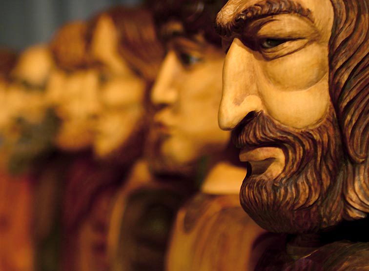 Die rund einen Meter hohen kolorierten Holzfiguren haben die slowakischen Puppentheater-Künstler Jana Pogorielova und Anton Dusa aus Bansky Bystrica in der mittleren Slowakei geschaffen. Sie erinnern an Figuren aus gotischen Flügelaltären.