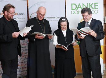 Ferdinand Kaineder, Leiter des Medienbüros der ordensgemeinschaften Österreich, Abtpräses Christian Haidinger, Vorsitzender der Superiorenkonferenz der männlichen Orden Österreichs, Sr. Beatrix Mayrhofer, Präsidentin der Vereinigung der Frauenorden Österreichs, und P. Erhard Rauch, Generalsekretär der Superiorenkonferenz der männlichen Orden Österreichs, freuen sich über die Summa 2014.