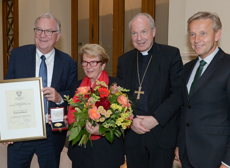Die großen Verdienste von Waltraud Klasnic um die Hospizbewegung in Österreich und die Aufarbeitung kirchlicher Missbrauchsfälle hat Kardinal Christoph Schönborn bei deren Auszeichnung mit der "Kardinal-Opilio-Rossi-Medaille" am Dienstagabend, 2. Juni 2015 in Wien hervorgehoben.