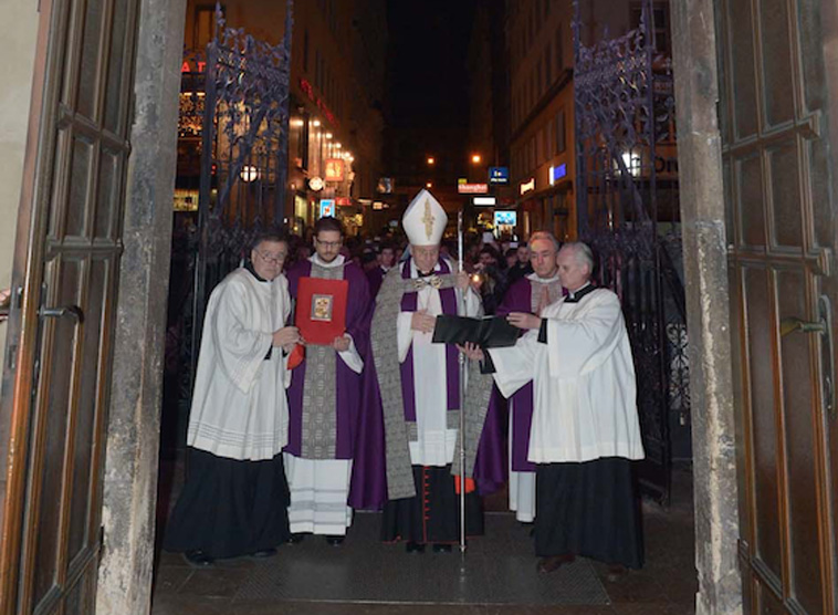Der Wiener Erzbischof Kardinal Christoph Schönborn öffnete am Samstag, 12. Dezember 2015 um 20 Uhr die Heilige Pforte der Barmherzigkeit im Stephansdom om nach dem dafür vorgesehenen Ritus. Dazu gehörte die Öffnung des Riesentores, anschließende Prozession, Schriftlesung und Ansprache des Wiener Erzbischofs.