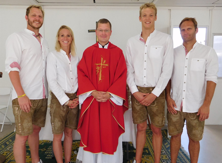 P. Johannes Paul Chavanne spendete den Schwimmern Jördis Steinegger und Felix Auböck im Olympischen Dorf das Sakrament der Firmung.