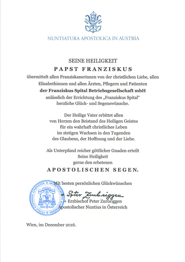 Das neue Franziskus Spital ist das Ergebnis einer Fusion zweier traditionsreicher Häuser der Wiener Spitalslandschaft. Das Krankenhaus St. Elisabeth, mehr als 300 Jahre angesiedelt im Bezirk Landstraße, ändert seinen Namen in Franziskus Spital Landstraße. Das Hartmannspital hat 2015 sein 150-jähriges Bestehen in Wien Margareten gefeiert und heißt ab 2017 Franziskus Spital Margareten. Das Franziskus Spital ist ein Wiener Spital, mit dem Schwerpunkt „Medizin für den Menschen im Alter“.