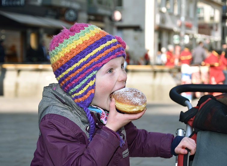 Auf dem Stephansplatz begegnen wir auch einer jungen Mutter mit ihren zwei kleinen Kindern. Diese greifen gerne zu: „Wir essen gerne Krapfen. Nicht nur zu Fasching, sondern auch zu Weihnachten“. Die Mutter selbst mag diesmal keinen Krapfen, aber vor allem ihre fünfjährige Tochter Elena steht auf die Süßspeise und bedankt sich herzlich, während sie vor unseren Augen genüsslich hineinbeißt.