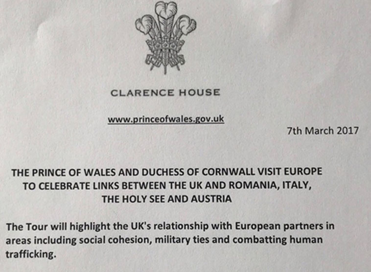 Die Reise geht aus einem offiziellen Schreiben des Büros des britischen Thronfolgers hervor, das der österreichische Bundespräsident Alexander Van der Bellen am Dienstag, 7. März 2017 im Kurznachrichtendienst Twitter veröffentlichte.