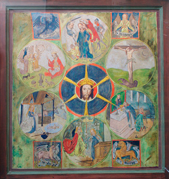Betrachtungsbild von Bruder Klaus, Leinwandtafel um 1475/80 gemalt. Das Meditationsbild zeigte in der Mitte Christus mit der Dornenkrone und davon ausgehend sechs Speichen und sechs Medaillons mit Szenen biblischer Heilsgeschichte. Als Radbild