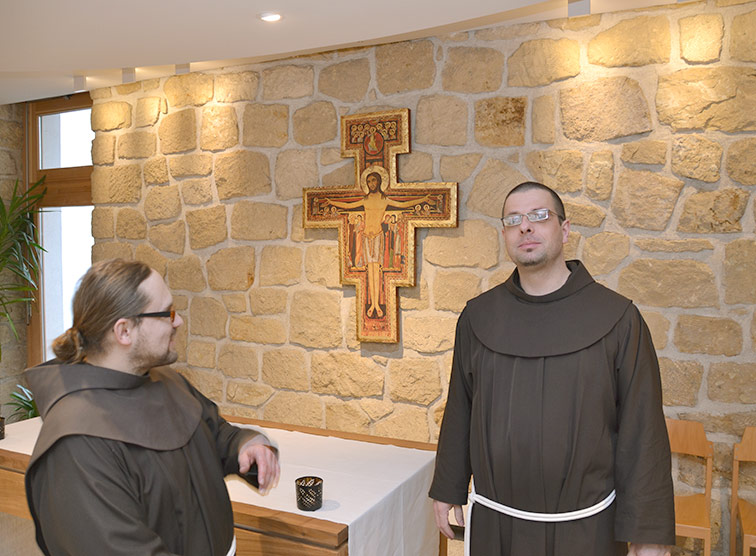 „La Verna“: P. Rufino Ziegerhofer OFM und P. Stefan Kitzmüller OFM in der neugestalteten Kapelle im Franziskanerkloster Maria Enzersdorf.