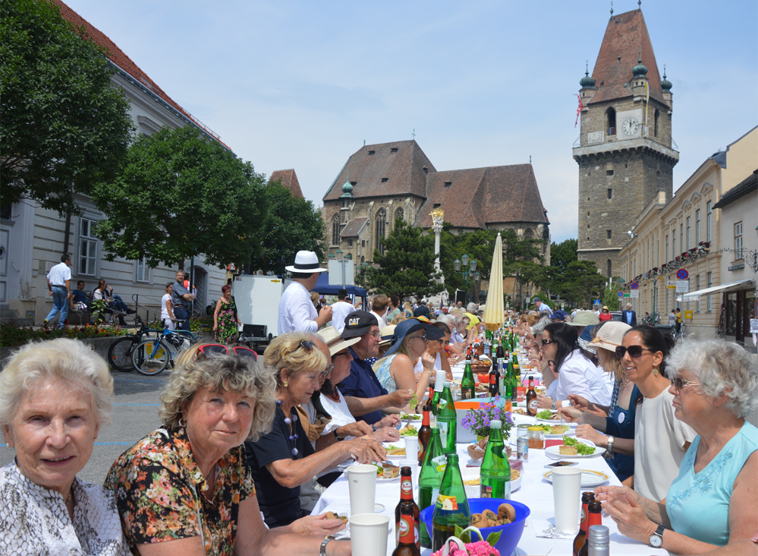 Am Pfingstsonntag, 4. Juni 2017 stand der Festgottesdienst in der Pfarrkirche ganz im Zeichen der Ökumene. Pfarrer Josef Grünwidl und Pfarrer Andreas Fasching leiteten die Feier. Auf der Empore sang ein großer, ökumenischer Chor unter der Leitung von Anthony Jenner. Der Auszug aus der Kirche führte auf den Markplatz ins Zentrum von Perchtoldsdorf. Dort fand passend zum Motto des Jubiläumsjahres „Mitten im Leben – Mitte im Leben“ die größte Pfingsttafel aller Zeiten statt. Mehr als 800 Gäste feierten miteinander. Für Speis und Trank sorgten viele Gastgeber und auch Perchtoldsdorfer Haurer, die den „Jubiläumswein“ verkauften.