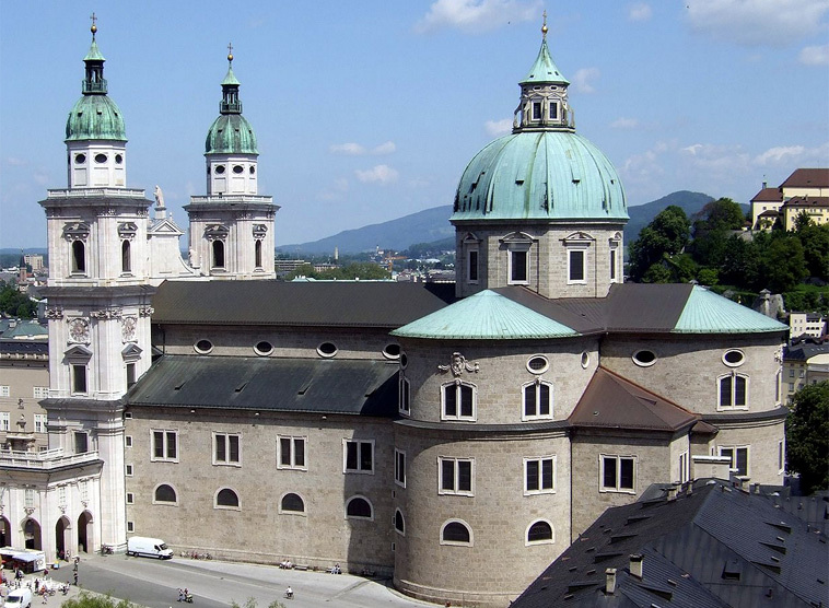Der Grundstein des barocken Salzburger Doms wurde 1611 unter Fürsterzbischof Wolf Dietrich von Raitenau gelegt. Sein Nachfolger, Fürsterzbischof Markus Sittikus, beauftragte Baumeister Santino Solari mit einer Umplanung. Der Dom konnte am 25. September 1628 unter Paris Lodron eingeweiht werden. Nach einem Bombardement 1944 stürzte die Kuppel des Domes ein. Nach nahezu 15-jähriger Wiederaufbauzeit fand am 1. Mai 1959 der erste Gottesdienst, geleitet von Erzbischof Andreas Rohracher, statt.