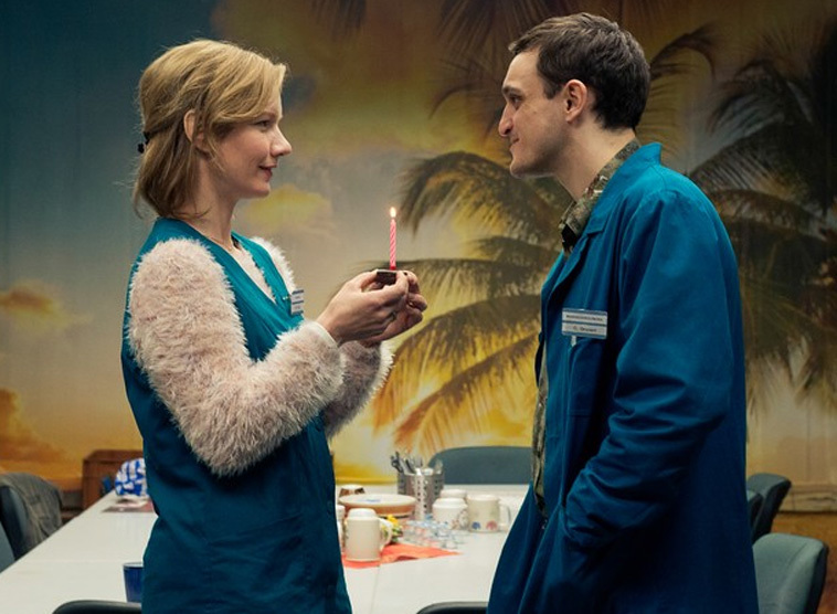 Viera Pirker: Mit einem fulminanten Einstieg zu den Klängen von „an der schönen blauen Donau“ à la Stanley Kubrick nimmt uns Regisseur Thomas Stuber in ein neues Universum mit: 2018 geht die Odyssee nicht in den Weltraum, sondern in die Gänge eines Hochregallagers, in dem Menschen miteinander arbeiten und menschlich bleiben in der Überfülle der Warenwelt. Wir erfahren fast nichts über ihre Geschichten, über ihr woher und wohin. Es wird deutlich, dass das „Woher“ keine großen Erfolge verzeichnet und ein „wohin“ im Leben für diese Menschen nicht mehr vorgesehen ist. Sie sind gewissermaßen gestrandet unter der Fototapete mit Palmenstrand im Aufenthaltsraum, sie begegnen sich dort mit Wohlwollen, Witz und Menschlichkeit und kommen sich behutsam nicht zu nah.
