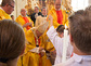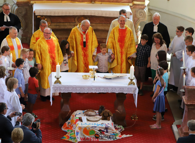 In der Festmesse predigte Kardinal Christoph Schönborn über das Reich Gottes, welches er dort zu finden vermute, wo wir zu unserem Nächsten gut sind, wo wir anderen nicht mit Hass begegnen, sondern mit Geduld und Verständnis. Als ein kleines Kind in der Kirche hörbar war, lud der Kardinal während seiner Predigt ein: „Lasst die Kinder mitreden! Papst Franziskus hat gesagt: Wen das stört, der solle hinausgehen.“ Damit setzte er ein starkes Zeichen des Willkommens auch an die jüngsten Mitfeiernden.