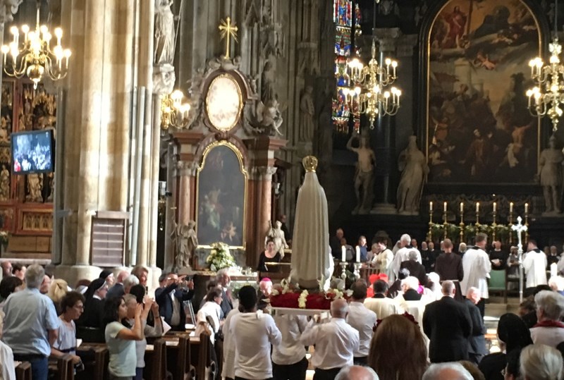 Wie auch bei der Maria-Namen-Feier am Samstag, der der Salzburger Erzbischof Franz Lackner vorgestanden war, begrüßte eingangs der geistliche Leiter der Rosenkranz-Sühnekreuzzug-Gebetsgemeinschaft, Pater Benno Mikocki, die zahlreichen Gläubigen im vollen Stephansdom. In einem Grußwort von Papst Franziskus an die Gläubigen, das verlesen wurde, bekundete der Papst seine innere Teilnahme am Gebet für den Frieden. "Kämpfen wir auch mit den geistlichen Waffen des Gebets und der Sühne", so Papst Franziskus in der von Kardinalstaatssekretär Pietro Parolin gezeichneten Botschaft, die mit dem apostolischen Segen für die Mitfeiernden schloss. Das persönliche Glaubenszeugnis im ersten Teil der Maria-Namen-Feier hielt wieder der Publizist Prof. Heinz Nussbaumer. Abgeschlossen wurde der erste Teil der Feier mit dem gemeinsamen Rosenkranzgebet, bevor die Festmesse begann.