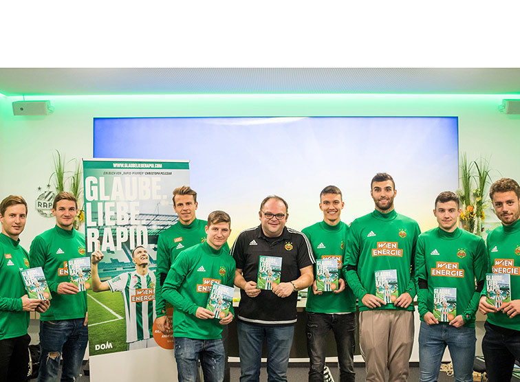 „Rapid-Pfarrer“ Christoph Pelczar mit Rapid-Stars und dem neuen Buch.