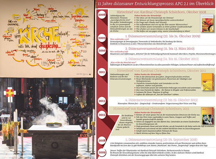 Andererseits ist die Zusammenfassung der damals 660 Pfarren in 140 Entwicklungsräume gelungen, die vielerorts bereits Schritte in Richtung Mission und Jüngerschaft erleichtert hat. Daher schlägt die Steuerungsgruppe der Diözesanreform (Erzbischof, Vikare, Pastoralamtsleiter, Ordinariatskanzler, Apg-Team) vor, am Prinzip einer immer stärker verpflichtenden Zusammenarbeit der Gemeinden festzuhalten, aber ein neues Etappenziel 2022 auf dem Weg zu größeren Einheiten neu zu fassen.