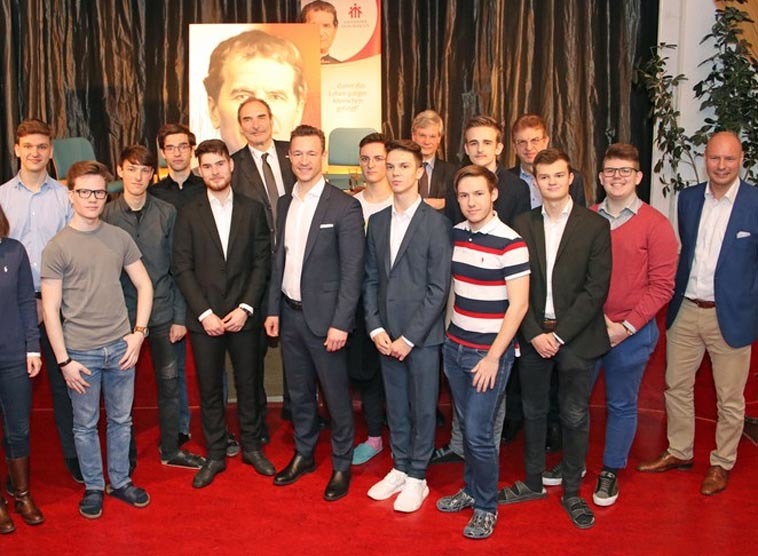 Die Schülerinnen und Schüler mit den Diskutanten: Minister Blümel (Mitte), Professor Beck (2. Reihe, 2. von rechts), Provinzial Pater Obermüller (2. Reihe, 1. von rechts) Direktor Hiller (4. von links) und ORF Moderator Roscher (rechts).