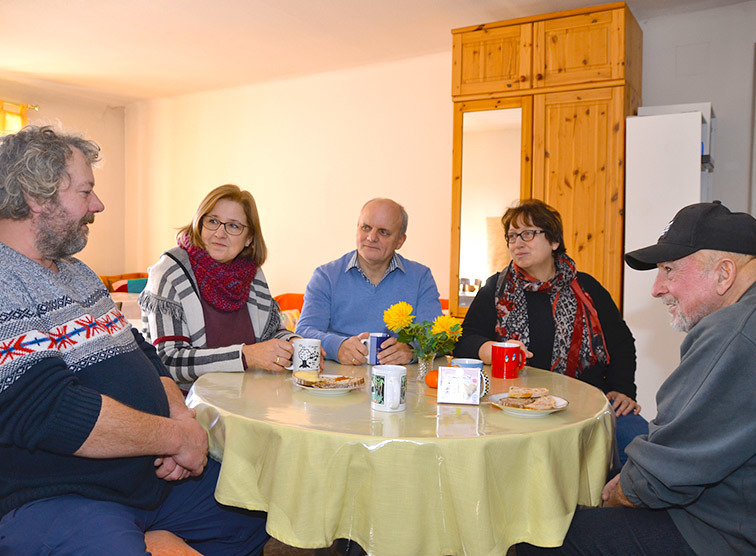 Wärmestube Stadlau: Lisa Smahel (2. v. li.)., Kurt Roth (Mitte) und Lisa Sensenbrenner (2. v. re.) im Gespräch mit Besuchern der Wärmestube.