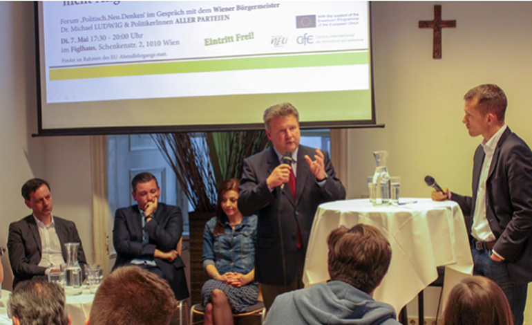 Die Initiative "Politisch.Neu.Denken" besteht aus jungen Vertretern aller politischen Parteien Österreichs und aus politisch engagierten NGO-Mitgliedern. Dabei geht es neben verbalem Brückenbau auch um konkretes Engagement: Im durch ein grausames Kriegsverbrechen im Bosnienkrieg bekannt gewordenen Srebrenica waren zwei Gruppen der Akademie für Dialog und Evangelisation am Solidaritäts-Projekt "Bauern helfen Bauern" beteiligt und bauten für Kriegsopfer mit Hilfe von Professionisten vor Ort Wohnhäuser.