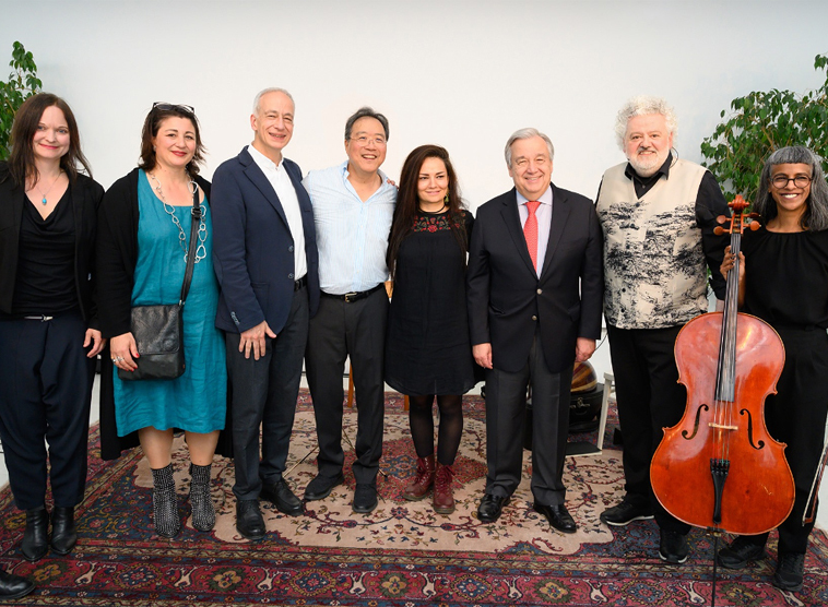 UN-Generalsekretär António Guterres hat am Montag, 27. Mai 2019 die Caritas-Kultureinrichtung "Brunnenpassage" in Wien-Ottakring besucht. Der renommierte amerikanische Cellist Yo-Yo Ma machte an diesem Tag in der Brunnenpassage mit seinem Bach-Projekt Station. Dabei handelt es sich um eine zweijährigen Reise, bei der die sechs Suiten für Solocello von Bach auf der ganzen Welt aufgeführt werden. Yo-Yo Ma, der auch UN-Friedensbotschafter ist, suchte zudem den Austausch mit lokalen Akteuren und Organisationen, um sich gemeinsam künstlerisch mit Themen von gesellschaftlicher Bedeutung zu befassen. Neben UN-Generalsekretär Guterres nahm u.a. auch Caritas-Präsident Michael Landau an der Begegnung in der Brunnenpassage teil.