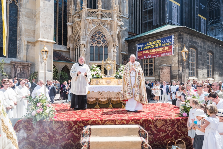 Die Konzentration auf die Eucharistie, die beim Hochfest Fronleichnam, das an diesem Donnerstag gefeiert wird, im Mittelpunkt steht, lehrt zugleich eine "liebende Aufmerksamkeit", mit der man auch dem Mitmenschen begegnen sollte. Das hat der Wiener Erzbischof, Kardinal Christoph Schönborn, bei einer Ansprache bei der traditionellen Fronleichnamsprozession am Michaelerplatz in der Wiener Innenstadt betont. Nicht zuletzt durch die überbordende Nutzung digitaler Medien komme es zu einer "immer größeren Zerstreuung", die einen "klaren Blick auf die Realität" verhindere. Ein solcher Blick, der den Mitmenschen in den Mittelpunkt rückt, sei nur durch Einübung und Konzentration möglich.