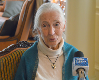 Jane Goodall sitzt in der Suite eines Grand Hotels unweit des Wiener Stephansdoms. Gepolsterte Möbel, weiche Teppiche, schwere Vorhänge, ein Luster hängt tief über den Tisch. „Wenn ich wählen könnte“, sagt die 85-jährige Britin am Ende unseres Interviews, „wäre ich jetzt lieber in der Natur.“