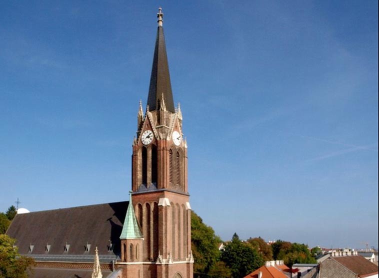 Eine Kapelle in der Währinger Pfarre Weinhaus wurde bereits im Jahr 1736 erbaut. Der Spatenstich der Pfarrkirche erfolgte am 16. September 1883. Geweiht wurde das im gotischen Stil erbaute Gotteshaus am 12. Mai 1889 durch Kardinal Cölestin Josef Ganglbauer. Endgültig fertiggestellt wurde die Kirche allerdings erst im Jahr 1893. Konzipiert ist sie als dreischiffige Anlage. Im Süden wird das Mittelschiff durch den 65 Meter hohen Turm abgeschlossen. Eine Besonderheit stellt der Rosenkranzweg im Garten hinter der Kirche dar, für den der Bildhauer Rochus Haas fünfzehn Bildstöcke schuf.